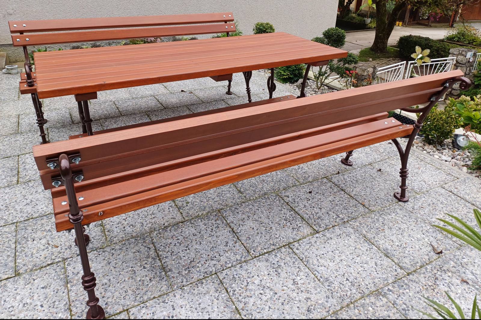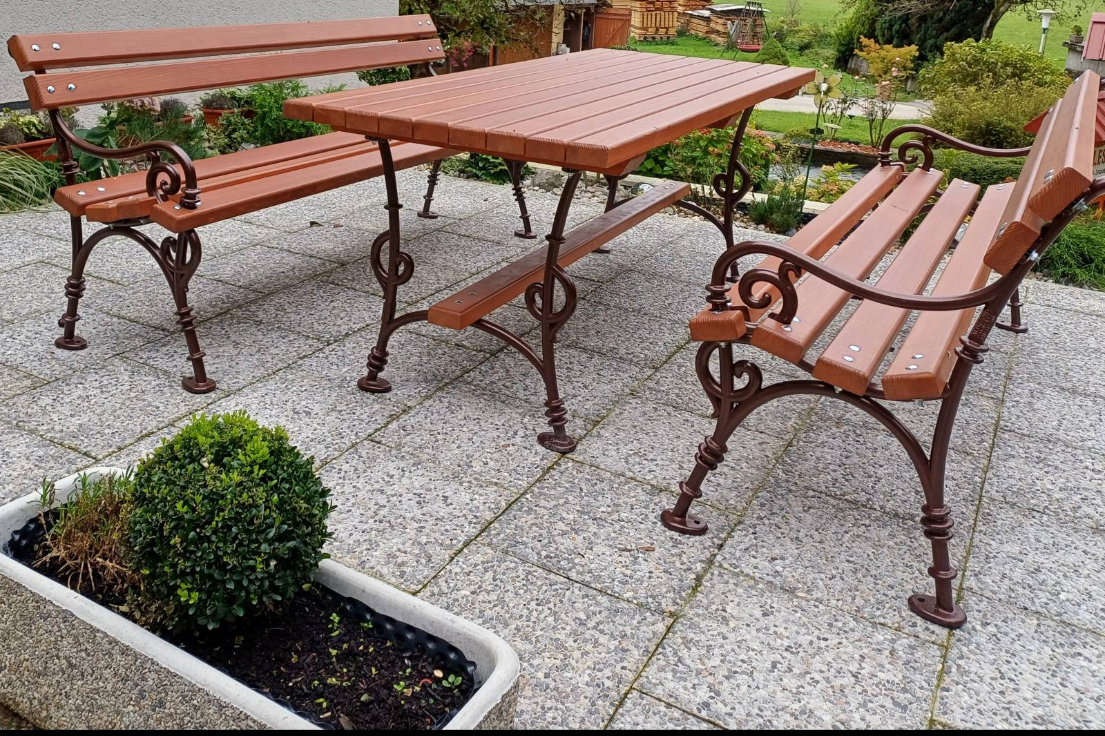 Vrtna sedežna garnitura je izdelana iz masivnega smrekovega lesa in zaščitena z lakom na vodni osnovi v odtenku češnje. Lito aluminijasto ogrodje klopi ne rjavi in je odporno proti odrgninam.