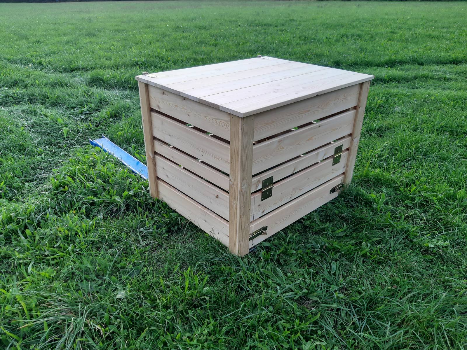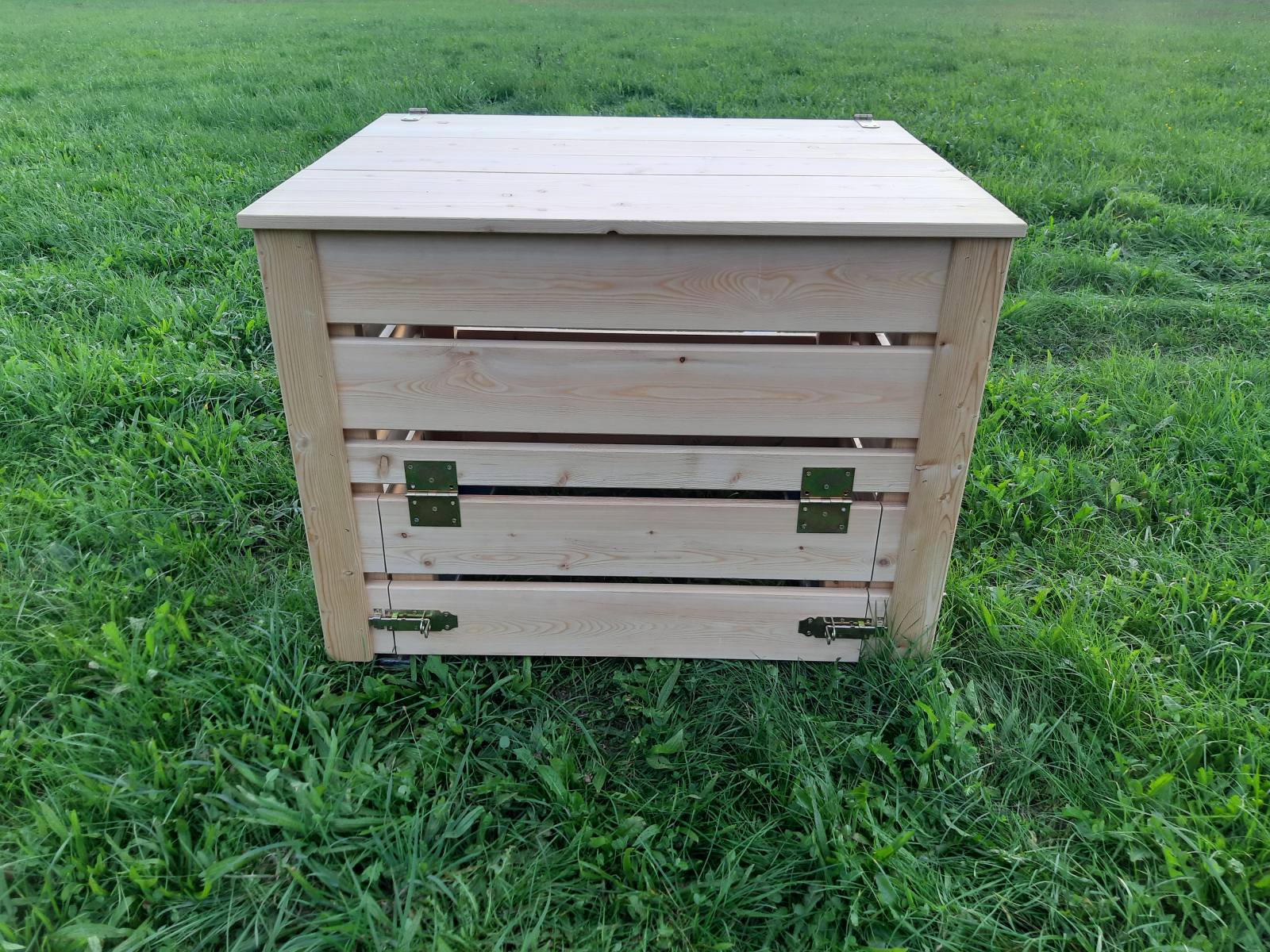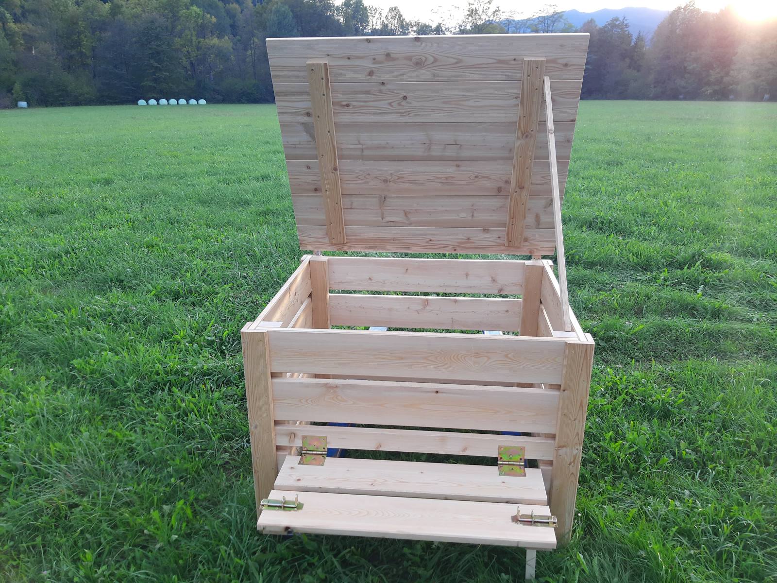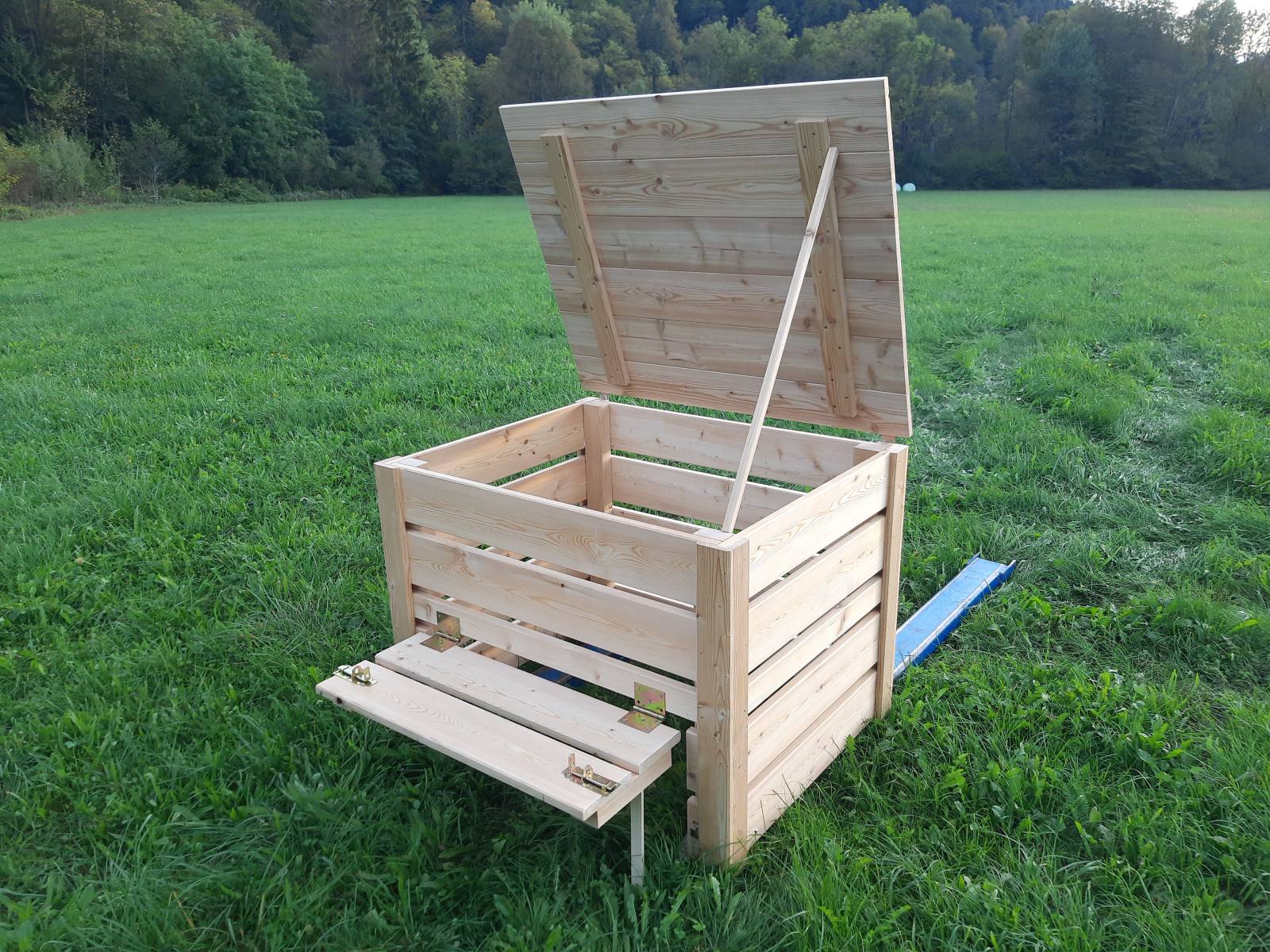 Kompostnik je izdelan iz desk sibirskega macesna 24 mm. Za lažji dostop do komposta so na spodnjem delu vratca, skozi katera lahko pobiramo najstarejši, že predelan kompost. Za zaščito pred živalmi je dodan tudi pokrov.